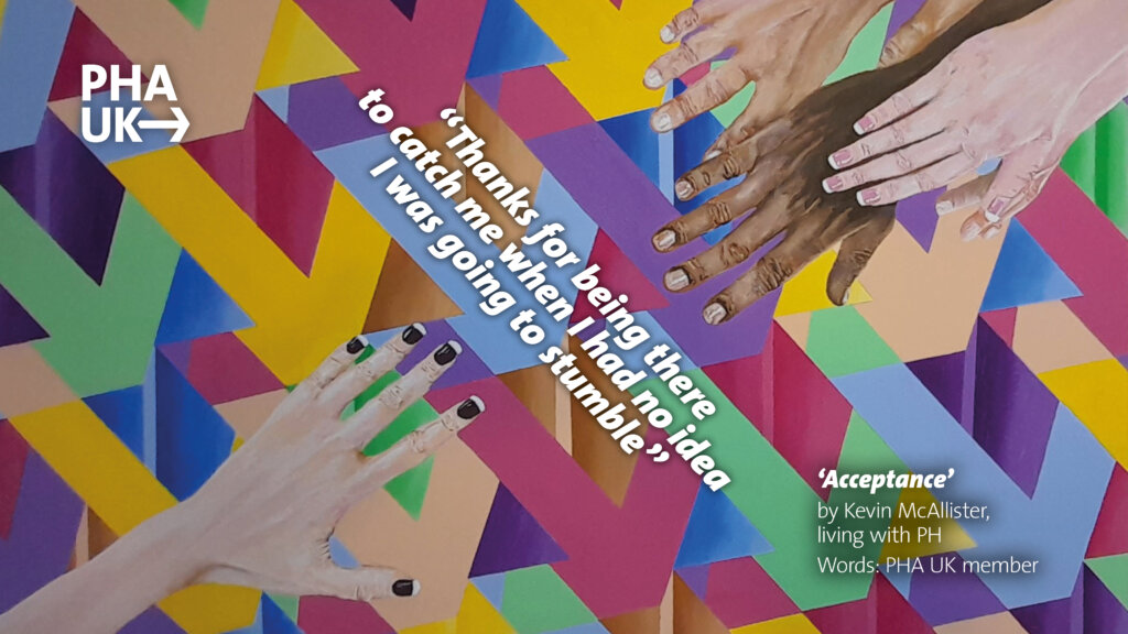 It incorporates part of the PHA UK logo in the form of colourful arrows travelling forwards, and hands reaching up and down in a show of mutual support.