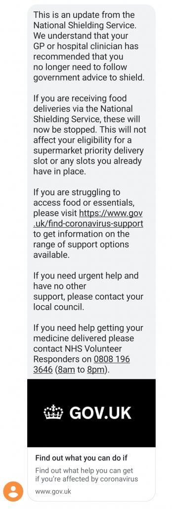 We have discovered that some people with pulmonary hypertension have been receiving notices advising them they no longer need to follow government advice to shield. These notices have come via a text message from the National Shielding Service or a letter from a GP practice.