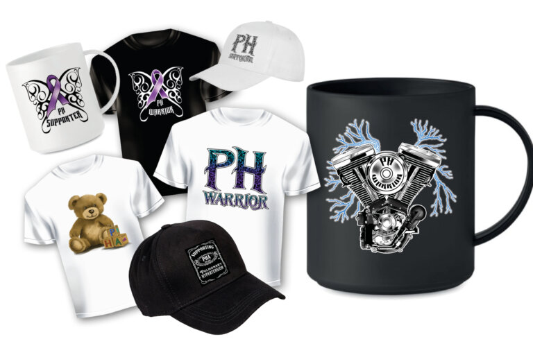 Talented PHA UK member Jamie Beglin has produced a range of eye-catching motif designs that can be used on any type of clothing or merchandise to help get people talking about PH and to raise money for our charity.