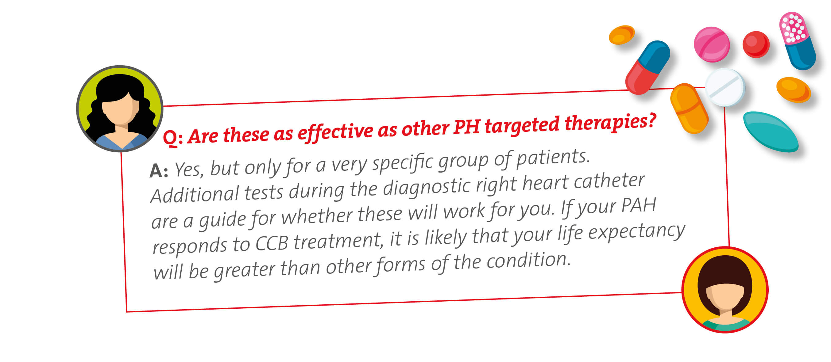 CCBs are usually well tolerated, but especially because high doses are needed, patients may be at greater risks of problems. Common problems are headache, dizziness, flushing, a pounding heartbeat and swollen ankles. That said, these are often features of PH, so always check with your PH centre if you are in any doubt.
