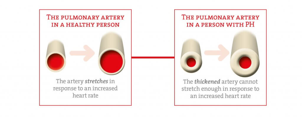 During periods of exercise, the heart beats more quickly to get more oxygen to the muscles. At the same time, the blood vessels carrying blood to the lungs (the pulmonary arteries) expand to allow more blood through. The pulmonary arteries do this by stretching slightly. In a person with PH, the walls of the pulmonary arteries are thicker, so are less able to stretch.
